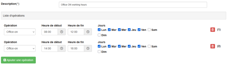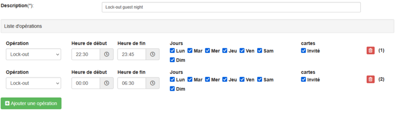 Si une opération doit couvrir la période de minuit (par exemple de 22:00 à 06:00), il est nécessaire de créer deux opérations : une de l’heure de début jusqu’à 23:45 et une seconde de 00:00 jusqu’à l’heure de fin.
