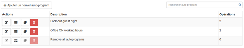 La liste des Auto‑programmes configurés pour vos serrures s’affiche.